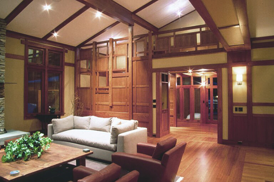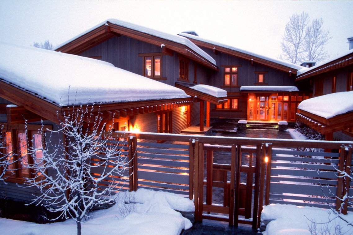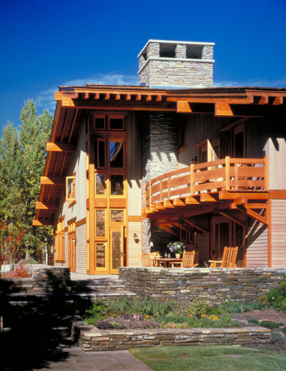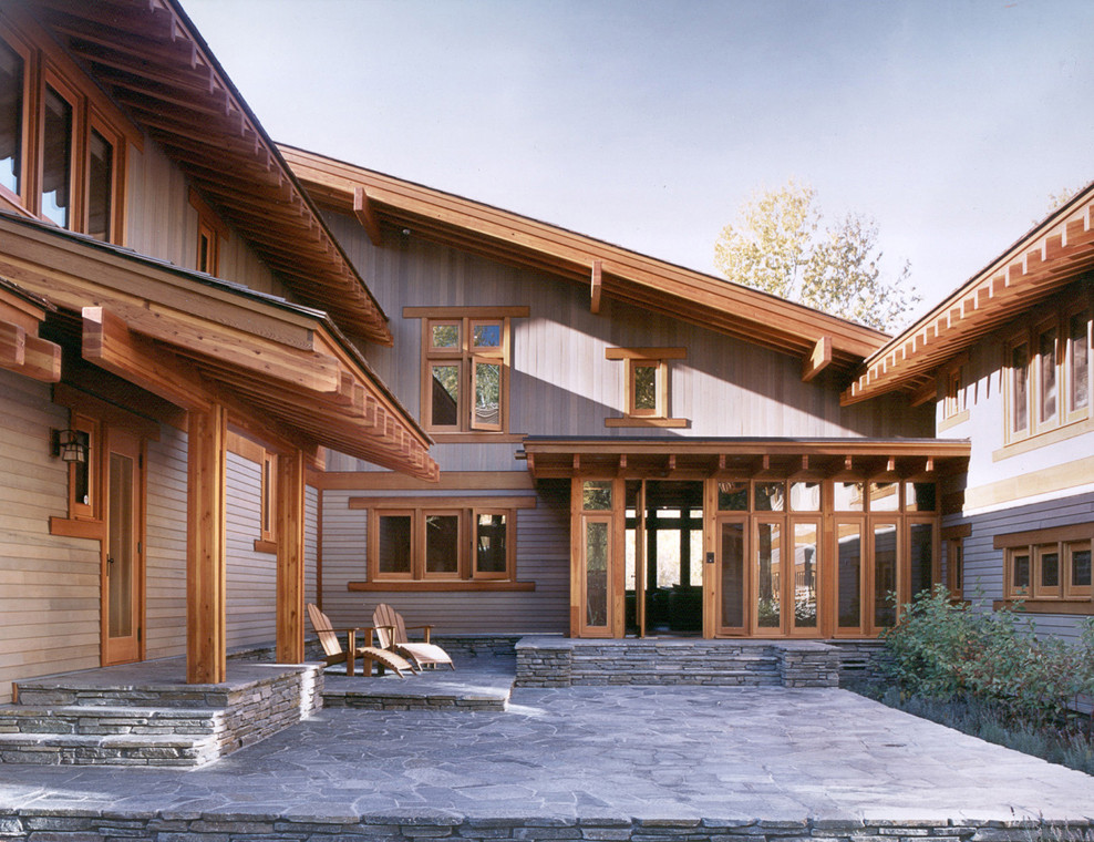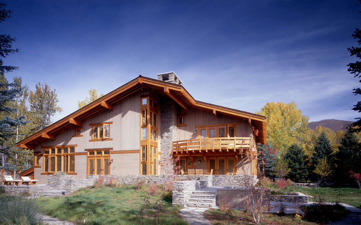Sun Valley House This free-standing house is linked to a guest house with a glass and wood gallery, 2 stories high, 10,000 square feet with 5 bedrooms and 7 bathrooms. Per the client's request, this house was inspired by the architects of the Arts and Crafts Movement, Greene & Greene.